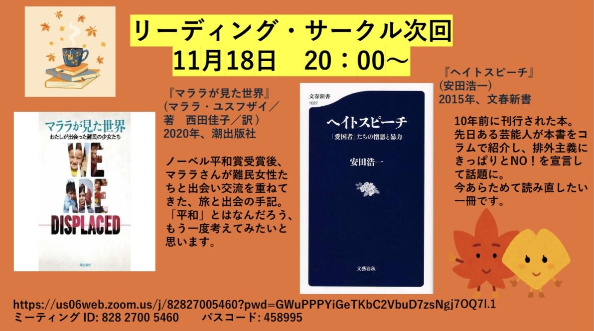 11月のリーディングサークルは11月18日(火)午後8時から1時間の予定です。ぜひおいでください。