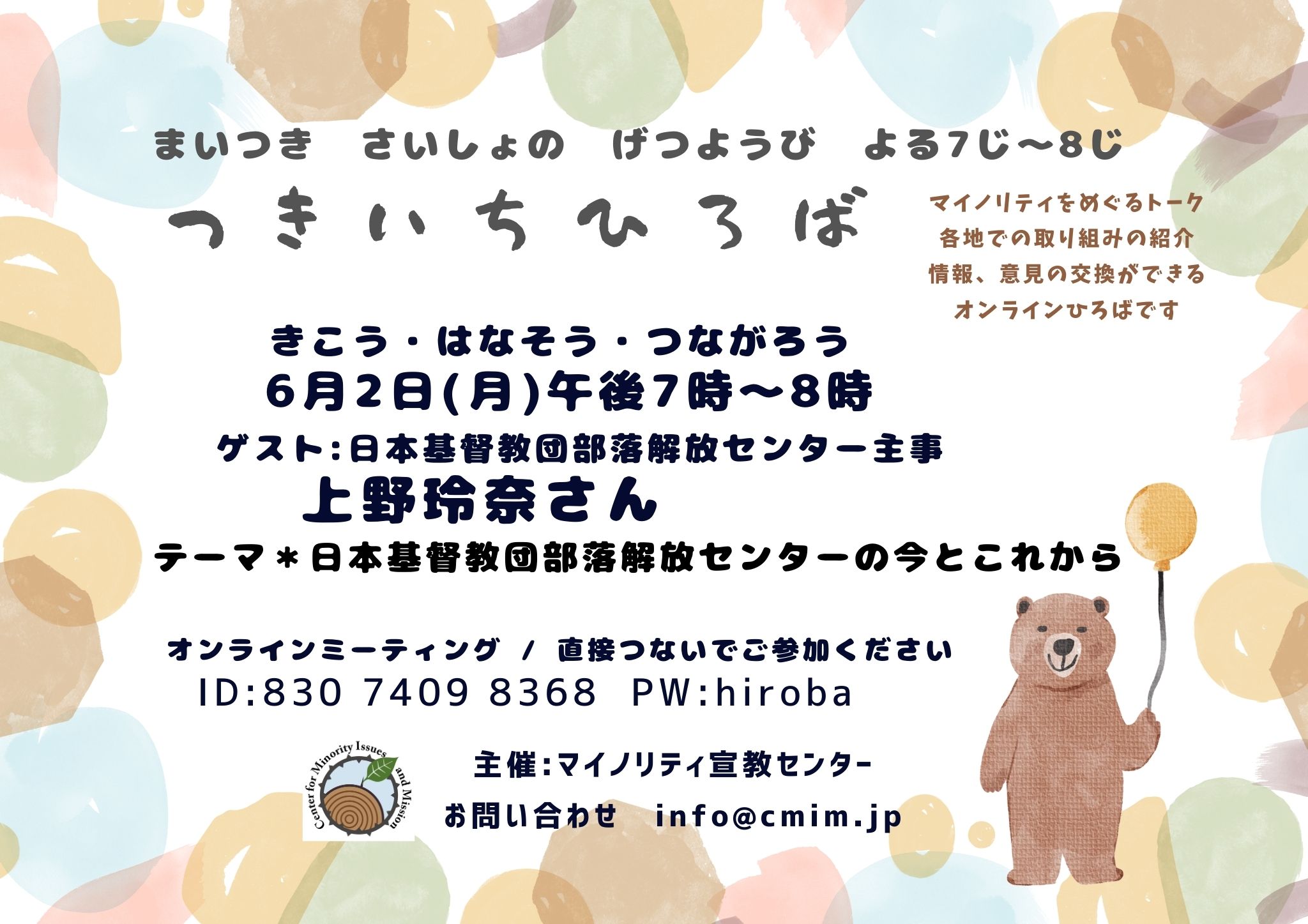 マイノリティ宣教センターの6月の「つきいちひろば」は、上野玲奈さん(日本基督教団部落解放センター主事)をゲストにお迎えして開催いたします。ぜひご参加ください。