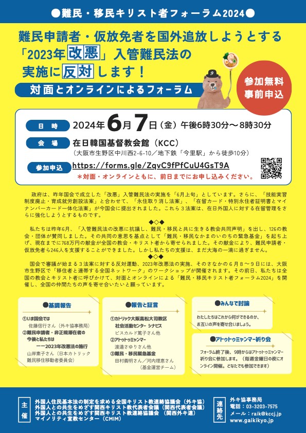2024年6月7日(金)午後6時半から行われる難民・移民キリスト者フォーラム2024のご案内です。
